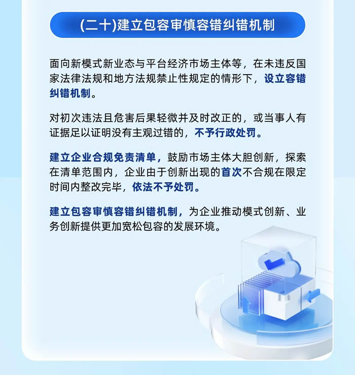 第六,建立包容審慎容錯糾錯機制,對初次違法且危害后果輕微并及時改正的,或當事人有證據(jù)足以證明沒有主觀過錯的,不予行政處罰;企業(yè)由于創(chuàng)新出現(xiàn)的首次不合規(guī)在限定時間內(nèi)整改完畢,依法不予處罰。