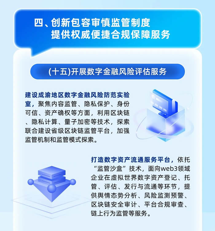 第一,開展數(shù)字金融風險評估服務,建設成渝地區(qū)數(shù)字金融風險防范實驗室,探索聯(lián)合建設省級區(qū)塊鏈監(jiān)管平臺,打造數(shù)字資產(chǎn)流通服務平臺。