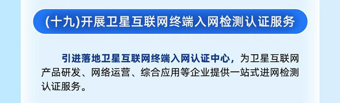 第五,開展衛(wèi)星互聯(lián)網(wǎng)終端入網(wǎng)檢測認證服務,為衛(wèi)星互聯(lián)網(wǎng)產(chǎn)品研發(fā)、網(wǎng)絡運營、綜合應用等企業(yè)提供一站式進網(wǎng)檢測認證服務。