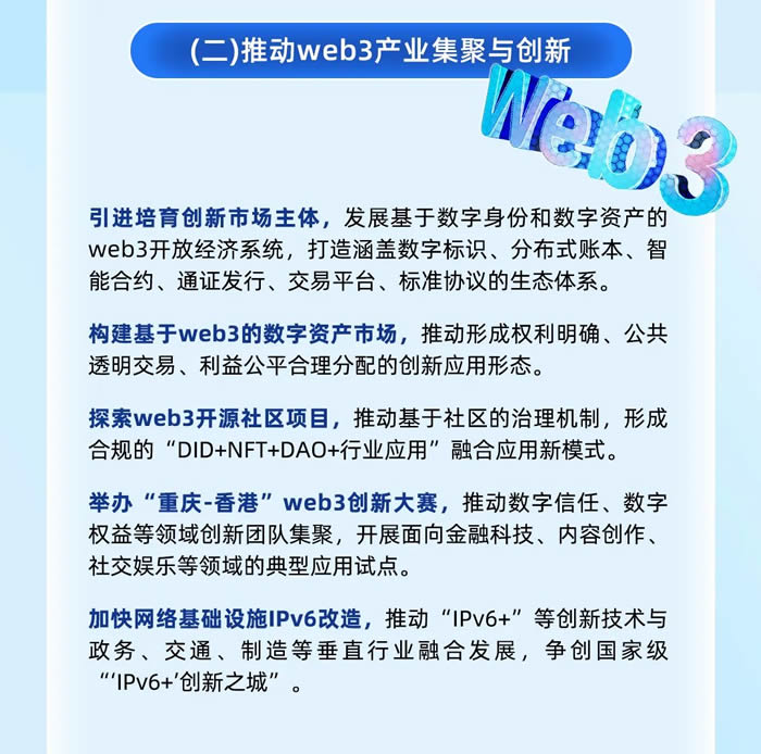 將引進培育創(chuàng)新市場主體,構(gòu)建基于web3的數(shù)字資產(chǎn)市場,探索web3開源社區(qū)項目,舉辦“重慶-香港”web3創(chuàng)新大賽,加快網(wǎng)絡基礎設施IPv6改造。