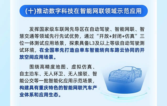智能網(wǎng)聯(lián)領域在全國率先打造由單車智能轉(zhuǎn)向車路云協(xié)同的開放空間應用場景,構(gòu)建具有重慶特色的智能網(wǎng)聯(lián)汽車產(chǎn)業(yè)體系和應用生態(tài)。