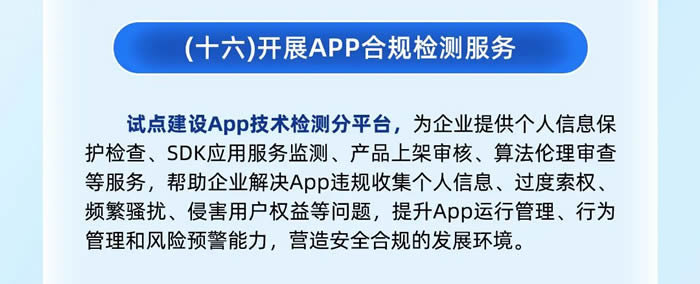 第二,開展APP合規(guī)檢測服務,為企業(yè)提供個人信息保護檢查、SDK應用服務監(jiān)測、產(chǎn)品上架審核、算法倫理審查等服務。
