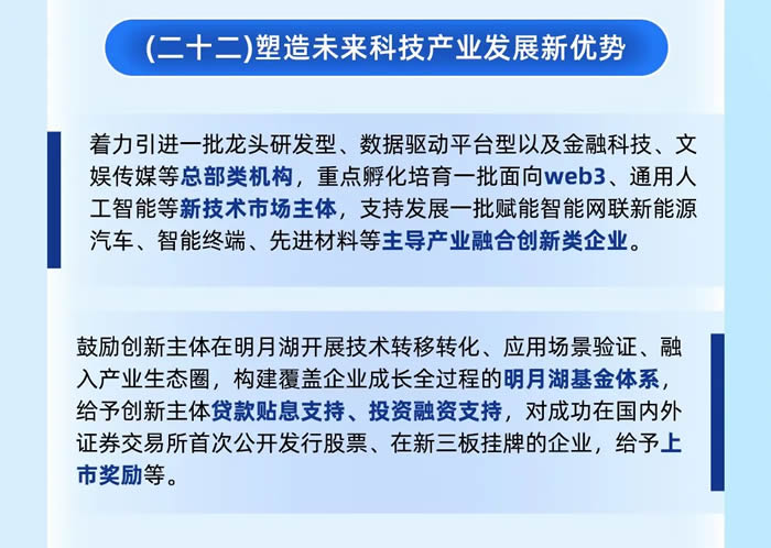將著力引進一批總部類機構(gòu)、重點孵化培育一批新技術(shù)市場主體、支持發(fā)展一批主導產(chǎn)業(yè)融合創(chuàng)新類企業(yè),構(gòu)建覆蓋企業(yè)成長全過程的明月湖基金體系,給予創(chuàng)新主體貸款貼息支持、投資融資支持,對符合條件的企業(yè)給予上市獎勵等。