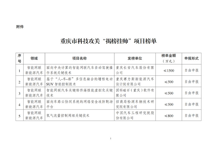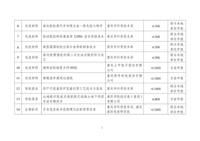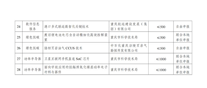 項目主要包括:智能網聯新能源汽車5項,由長安汽車公司等單位提出,重點解決自動駕駛操作系統等重要技術問題。先進材料6項,由再升科技公司等單位提出,重點解決耐高溫中高效過濾紙等重要技術問題。智能裝備2項,由重慶市科技局等單位提出,重點解決國產化氫基豎爐裝備等重要技術問題。生物醫藥8項,由重慶金鳳實驗室等單位提出,重點解決抗腫瘤抗體藥物等重要技術問題。軟件信息服務3項,由中科云從公司等單位提出,重點解決人工智能模型訓練等重要技術問題。綠色低碳2項,由中石化涪陵頁巖氣公司等單位提出,重點解決二氧化碳封存等重要技術問題。功率半導體2項,由重慶市科技局提出。