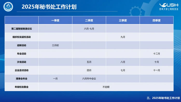 隨后副會(huì)長(zhǎng)兼秘書長(zhǎng)徐振宇向大家匯報(bào)2024年自吉林大學(xué)上海校友會(huì)機(jī)械分會(huì)成立以來的具體工作開展情況、費(fèi)用使用情況及2025年的工作計(jì)劃。同時(shí)會(huì)上審議通過了機(jī)械分會(huì)秘書處的組織架構(gòu),正式任命兩位副秘書長(zhǎng):03級(jí)機(jī)械工程校友趙幗娟博士和08級(jí)機(jī)械工程校友陳希光,值得一提的是兩位校友在上海校友會(huì)2024年年終總結(jié)會(huì)上雙雙榮獲上海校友會(huì)優(yōu)秀志愿者稱號(hào)。徐振宇秘書長(zhǎng)表示,新的一年,機(jī)械分會(huì)秘書處的主要工作是打造品牌,聚攏人氣,充分的聯(lián)絡(luò)校友,發(fā)動(dòng)校友,讓更多的人參與到分會(huì)當(dāng)中來,為我們廣大的校友,為母校多做貢獻(xiàn)。