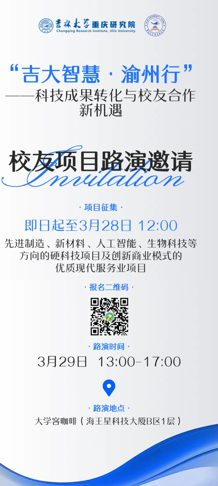本次路演旨在搭建吉林大學與重慶校友、社會各界的合作橋梁,促進高校科研成果落地轉化,加強校友間交流互動,實現資源共享、優勢互補,推動重慶地區產業發展與校友事業共同進步。