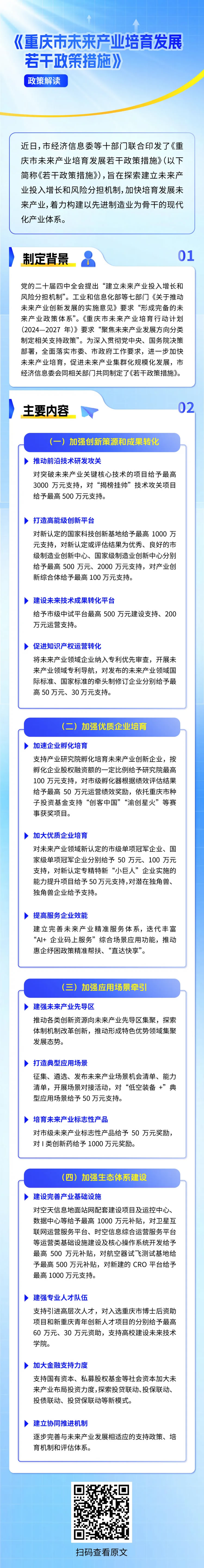 1月13日,市經信、發改、科技等10個市級部門聯合印發《重慶市未來產業培育發展若干政策措施》(下稱《措施》),將從平臺建設、人才引育等多方面出臺14條“政策干貨”發展未來產業,其中對于突破未來產業關鍵核心技術的項目將給予最高3000萬元支持。